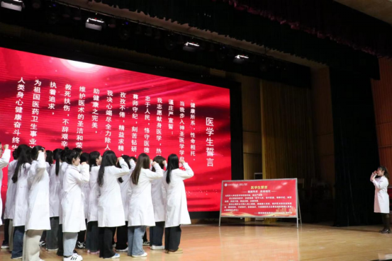 最后,全体师生身着白衣,在医学院副院长辛明杰院长的带领下,高举右拳庄严宣誓,矢志誓言,铿锵有力,掷地有声,激发了同学们为医学卫生事业奋斗终身的决心和坚定信念。