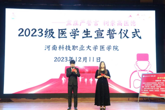 为培养医学院新生职业道德,牢记医学初心,增添学习动力,激发医学生责任感、使命感,增强献身医学事业的理想信念。2023年12月11日,河南科技职业大学2023届医学生宣誓仪式在校图书馆隆重举行,以此作为医学生从医路上的第一堂思政课。