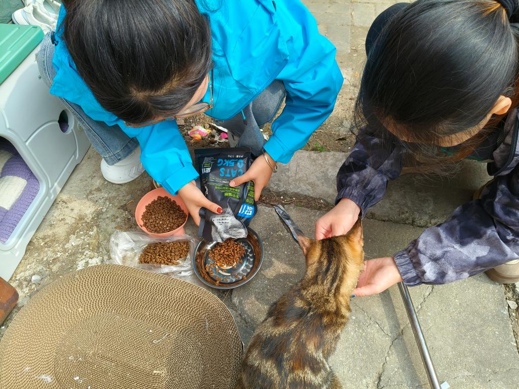 活动前期,医学院团总支通过校园小助手、微信群等渠道发出倡议,呼吁同学们捐献猫窝、猫粮、保暖垫等物资。倡议一经发出,便得到同学们的热烈响应。大家纷纷将闲置的宠物用品、保暖物资送至指定收集点,每一件物资都承载着对流浪动物的深切关爱与牵挂。活动当天,志愿者们分成小组,携带收集到的爱心物资前往校园内流浪猫常出没的区域。大家分工协作,有的小心翼翼地摆放猫窝,确保猫咪能安全舒适地栖息;有的均匀撒放猫粮、添置清水,为流浪猫补充能量;有的仔细清理活动区域的杂物,为它们营造干净整洁的生存环境。志愿者们的温柔举动与耐心呵护,让原本警惕的流浪猫逐渐放下戒备、纷纷靠近觅食,构成了校园里一幅温馨和谐的画面。