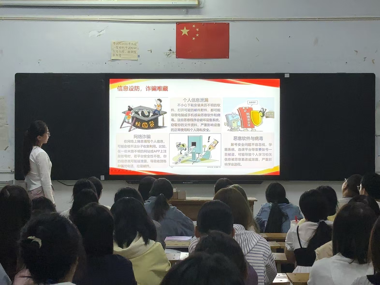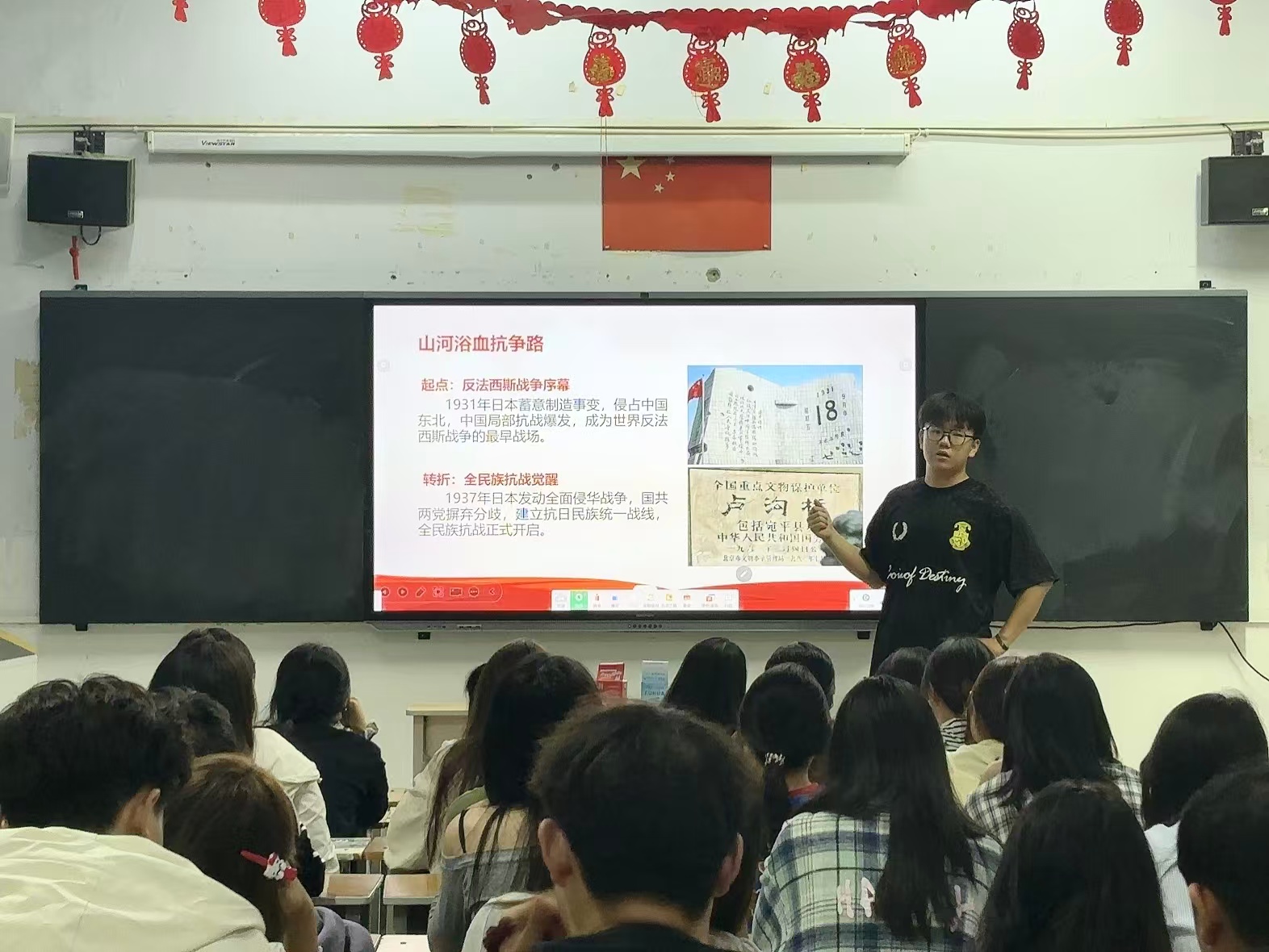 班会以“历史教育+安全普及”为核心,分两大板块有序开展,为同学们带来一堂兼具思想深度与实用价值的课程。班会伊始,主讲人围绕“纪念中国人民抗日战争暨世界反法西斯战争胜利80周年”展开讲解,带领同学们回顾14年抗战历程中军民同心、浴血奋战的峥嵘岁月。随后,全体同学以严肃认真的态度共同观看九三阅兵视频,整齐的受阅方阵、先进的武器装备依次亮相,强军铁阵不仅彰显了中国硬核的国防实力,更让同学们直观感受到国家发展的底气与守护和平的决心,深刻理解“以史为鉴,开创未来”的意义。历史教育环节结束后,班会转入校园安全知识普及。主讲人结合真实案例,从消防安全、网络安全、出行安全等维度展开讲解。同学们全程专注聆听,不时记录关键要点,学习氛围浓厚。