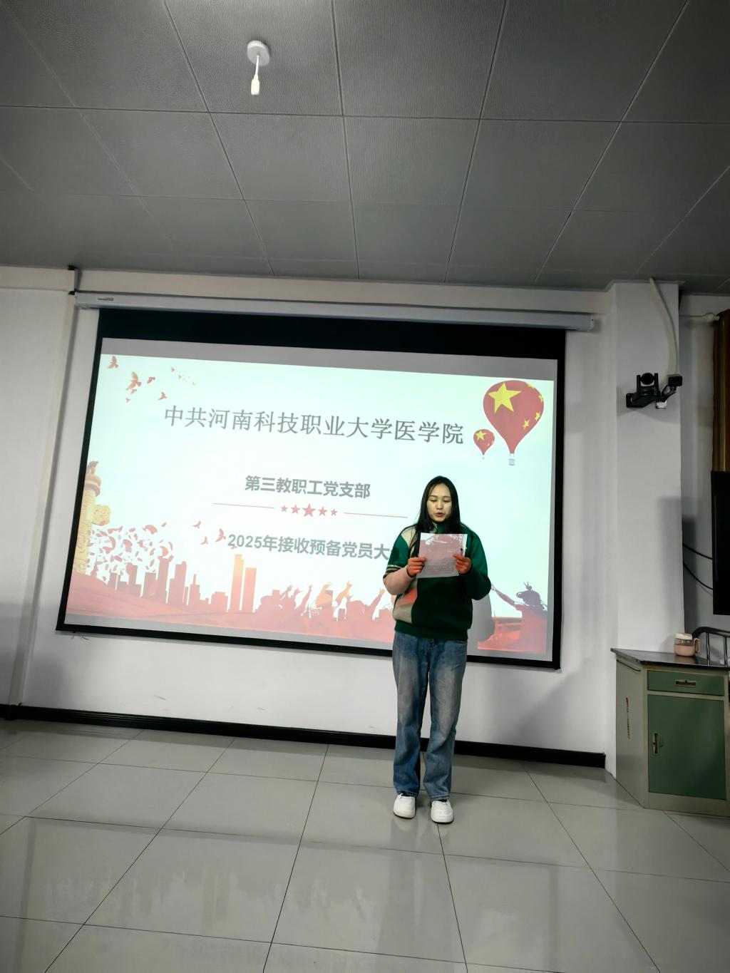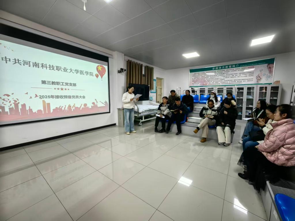 2025年12月11日中午,中共河南科技职业大学医学院第三教职工党支部在明德楼401室召开了关于接收葛恩会和孟小兴同志为预备党员的接收大会。该会由医学院第三教职工支部书记景奕文同志主持,该支部全体党员同志和预备党员参与此次会议。