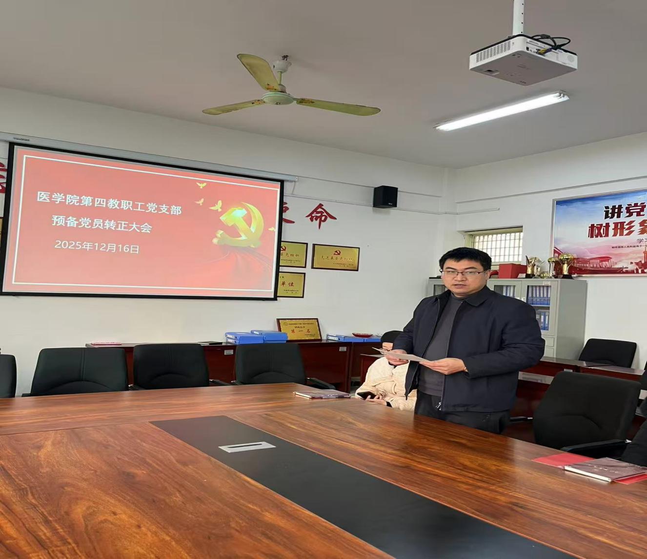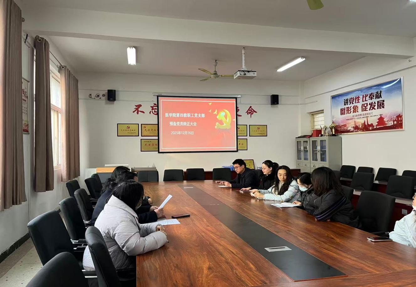 为严格党员发展程序,强化党员队伍建设,2025年12月18日,医学院第四教职工党支部召开预备党员转正会议。会议由党支部书记张德言同志主持,全体党员参加会议。