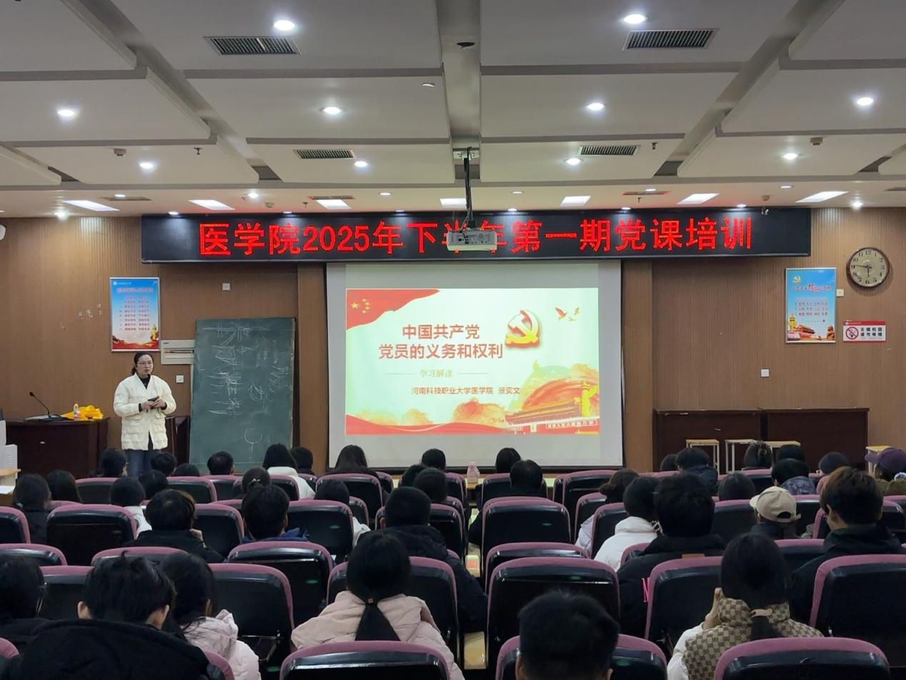 为引导入党积极分子深刻领悟党员义务与权利的核心内涵,筑牢信仰之基、补足精神之钙、把稳思想之舵。2025年12月22日,中共河南科技职业大学医学院委员会于老综合楼西北一举办第二期入党积极分子培训。第一讲党课以“中国共产党党员的权利与义务”为主题,由医学院副院长景奕文担任主讲人。