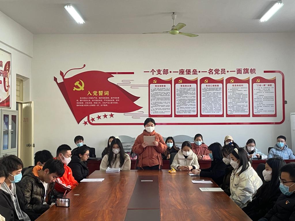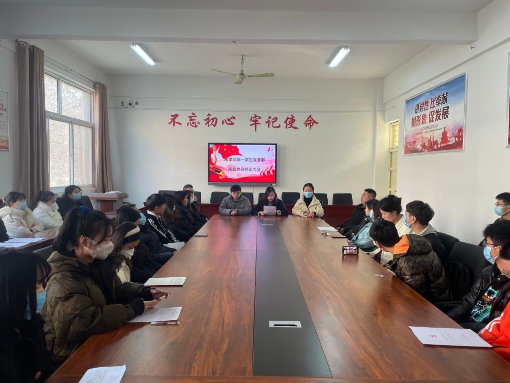 2021年12月22日中午,医学院第一学生党支部在明德楼201召开党员大会,会议由支部书记孙琳清主持召开,组织委员苑倩倩老师、宣传委员高山老师等共26名正式党员、30余名预备党员参会。