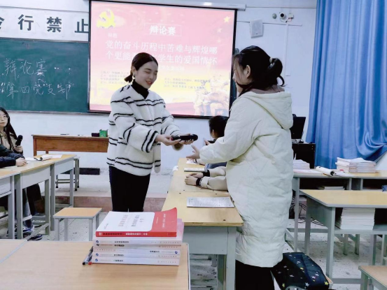 赛场气氛紧张而热烈,双方辩手你来我往,侃侃而谈。经过激烈的思想碰撞,第四学生党支部辩论赛圆满结束。赛后,由旁观同学以及陈书记投票选出本次辩论赛的获胜方,最终正方获得了胜利。