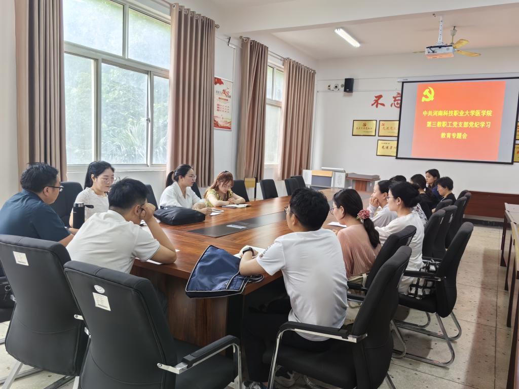 2024年5月30日下午,中共河南科技职业大学医学院第三教职工党支部在明德楼201党政会议室召开学习《中国共产党纪律处分条例》新修订版教育专题会。会议由医学院第三教职工党支部景奕文书记主持,支部全体教师党员参加。