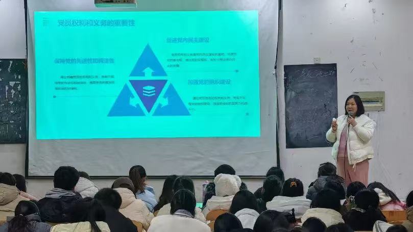 随后,韩老师围绕“党的权力和义务”这一主题展开了详细讲解。她指出,党员的权利是党员在党内应当享有的权益,包括参加党的会议、讨论和表决党内事务、选举和被选举等。这些权利是党员参与党内生活、发挥先锋模范作用的重要保障。同时,党员也必须履行相应的义务,如遵守党的纪律、执行党的决定、维护党的团结和统一等。这些义务是党员对党组织和人民应尽的责任,也是保持党的先进性和纯洁性的必然要求。