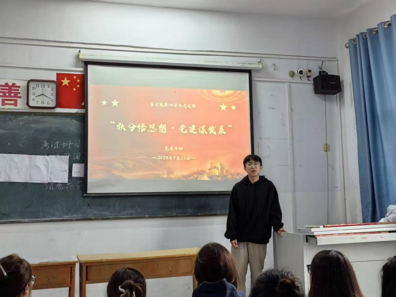 2025年9月23日,医学院第四学生党支部于励志楼409室召开以“秋分悟思想,党建谋发展”为主题的党建活动。金秋送爽,丹桂飘香。在秋分节气来临之际,为引导学生党员传承中华优秀传统文化,增强服务社会、助力乡村振兴的责任感与使命感,本次活动由党支部书记陈莉主持开展,以理论学习、文化研讨、实践部署相结合的形式,让学生党员在节气文化中感悟初心使命。