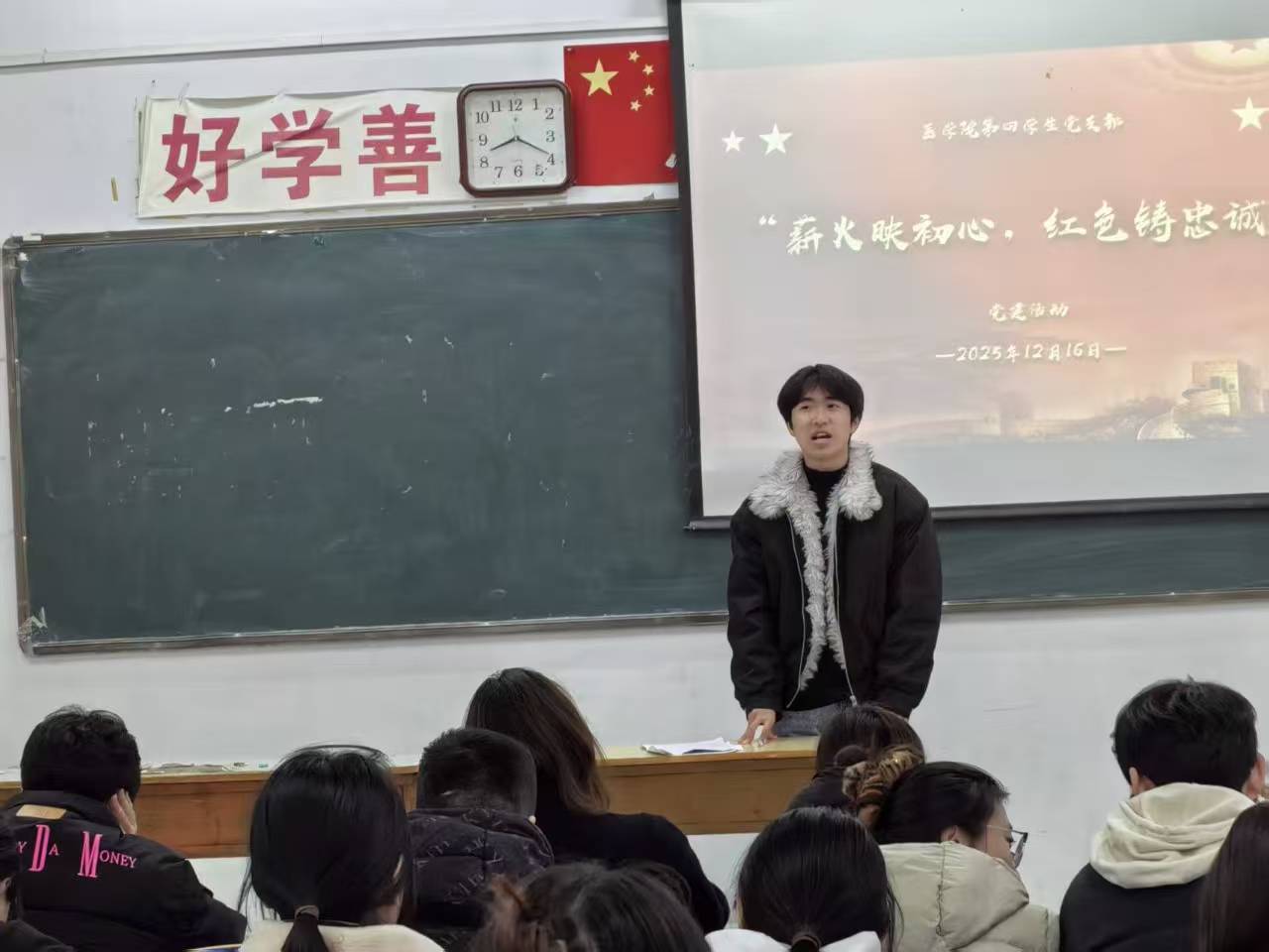 2025年12月16日13:00,于励志楼409室,医学院第四学生党支部以“薪火映初心,红色铸忠诚”为主题的党建活动。目的为深化青年学生的理想信念教育,引导大学生传承红色基因、勇担时代使命。我们党支部组织青年共同观看《赓续红色血脉,传承奋斗精神》专题纪录片,我们支部各学生党员、入党积极分子代表齐聚一堂,共同重温峥嵘岁月,汲取奋进力量。